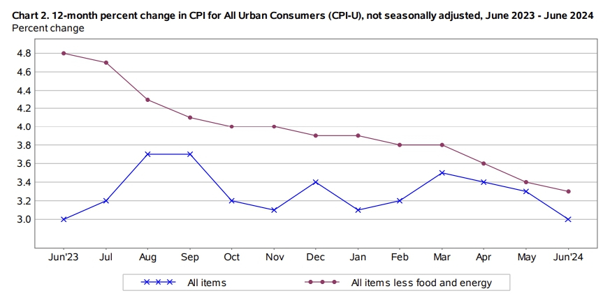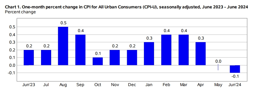 이날 미국 노동부 통계국에 따르면 지난 6월 헤드라인 CPI는 전월비 0.1% 하락했고, 전년비로는 3.0% 상승한 것으로 나타났다. 다우존스가 발표한 경제학자들의 예상 평균은 전월비 0.1% 상승, 전년비 3.1% 상승이었다. 6월의 월별 물가상승률은 2020년 5월 이후 4년 여 만에 처음으로 하락한 것이다. 연간 기준 3.0%의 물가상승률 역시 3년 만에 최저 수준이다.