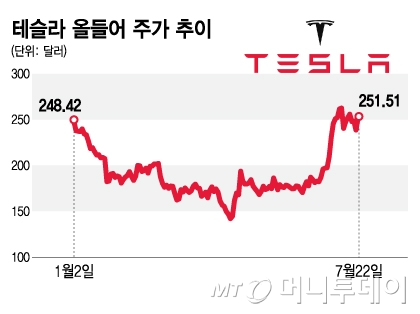 이후 일론 머스크 테슬라 최고경영자(CEO)가 오는 8월8일로 공표했던 로보택시(무인 자율주행 택시) 공개 날짜가 두어달 연기될 것이란 블룸버그 보도가 나오며 주가가 급락한 뒤 240~250달러선에서 등락하고 있다.