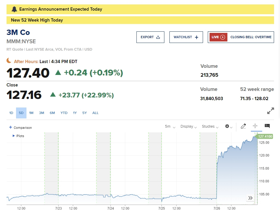 이날 시장에선 다우존스 편입 종목 가운데 전통 화학주인 3M이 21% 이상 폭등하면서 분위기를 주도했다. 하루 상승폭으로는 1972년 이후 52년 만에 최대치다. 3M은 이날 실적을 내놨는데 2분기 조정순이익이 주당 1.93달러를 기록해 LSEG가 추정한 주당 1.68달러를 훨씬 넘어섰다.