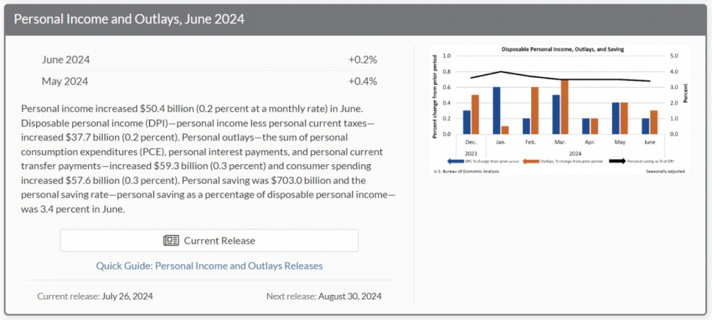 이날 미국 상무부 경제분석국은 지난 6월에 헤드라인 PCE가 전년비 2.5% 상승한 것으로 나타나 전월에 비해 0.1%p 하락했다고 밝혔다. PCE는 지난 5개월간 2월 2.5%, 3월 2.7%, 4월 2.7%, 5월 2.6%, 6월 2.5%를 기록해 재상승했다가 다시 우하향 하는 모습을 그리고 있다. 중앙은행인 연준의 목표는 이를 2% 수준까지 낮추는 것이다.
