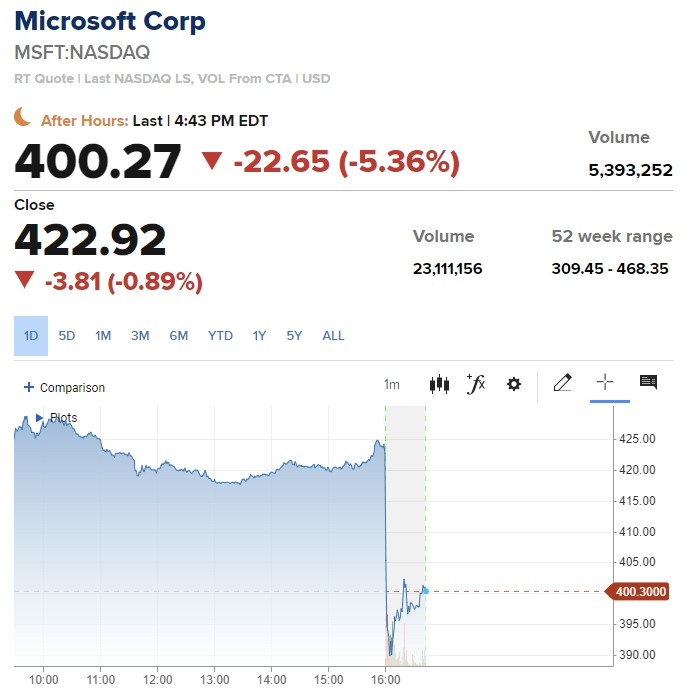 이날 마이크로소프트(MS)는 2분기 실적발표를 통해 매출이 6473억 달러, 주당 순이익이 2.95달러를 기록했다고 밝혔다. 둘다 예상치인 6439억 달러와 2.93달러를 상회한 실적이다. 그러나 투자자들은 시간외 마감 거래에서 매도세에 나서면서 주가는 5% 이상 하락하고 있다.