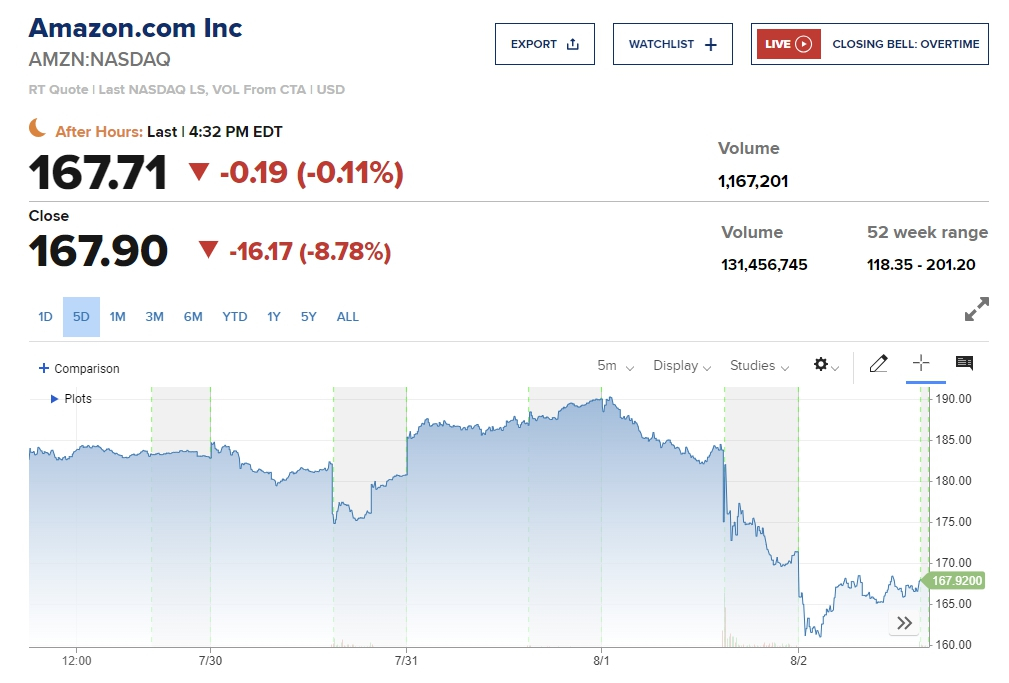 이날 미국 대표 금융주인 뱅크오브아메리카(BOA)와 웰스파고가 각각 5~6% 안팎 하락했다. 전일 기대에 못 미치는 실적을 내놓은 아마존은 무려 8.78%나 급락하면서 AI 랠리에서 이탈하는 듯한 모습을 보였다.