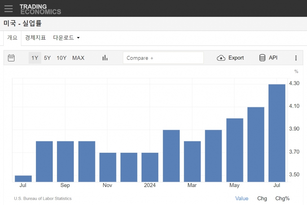 7월에 실업률은 4.3%로 집계됐다. 이는 전월 4.1%에서 0.2%p 높아진 것이다. 실업률이 4%대 중반으로 어느새 뛰어오르면서 인플레이션을 잡기 위해 1년 이상 유지하고 있는 5.25~5.50% 수준의 기준금리가 경기를 옥죄고 있다는 지적이 나온다. 전일 주식시장이 연방준비제도(Fed)의 이틀 전 금리인하 가능성 시사를 하반기 침체 우려로 받아들인 것이 전혀 근거가 없는 게 아니라는 풀이가 가능하다.