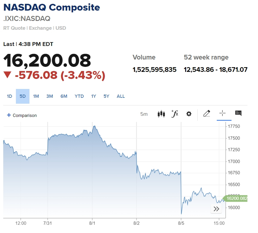 증시는 이날 아시아 증시의 폭락 속에 흥분한 투자자들의 동요를 막지 못했다. 지난 금요일에 나온 실망스러운 7월 일자리 보고서 이후 미국발 경기침체 우려가 각국 증시를 뒤덮으면서 심리적인 투매 현상이 벌어졌다. 이날 엔비디아는 6.36% 급락한 주당 100.45달러로 간신히 마지노선을 지켰다. 애플도 4.82%나 빠지면서 주요 주주였던 워렌 버핏 버크셔해서웨이의 이탈 후유증을 노출했다. 테슬라가 4.23%, 슈퍼마이크로컴퓨터도 2.53% 빠졌다.