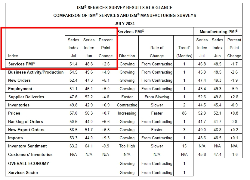 이날 경기침체 우려가 개장초부터 증시를 옥죈 가운데 미국의 서비스업 지수가 확장세로 나타나면 급락하던 증시의 낙폭이 다소 줄었다. 미국 공급관리협회(ISM)가 발표한 7월 미국 서비스업 구매관리자지수(PMI)는 51.4를 기록해 전월비 2.6p 상승한 것으로 나타났다. 블룸버그가 조사한 이코노미스트들의 전망치에 따르면 이 지수는 51.4로 지난 6월 48.8에서 크게 개선되며 위축에서 확장으로 돌아섰을 것으로 예상됐는데 그 기대에 부합한 셈이다.