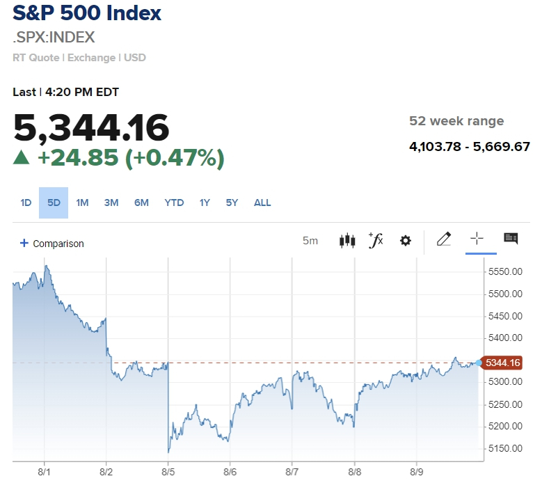 뉴욕증시가 전일 큰 반등세의 방향성을 지키며 이번주 드라마처럼 펼쳐졌던 변동폭을 축소했다. 아시아 시장과 같은 블랙먼데이를 겪지는 않았지만 주초 심각한 하락세를 빠르게 회복해 경기침체 우려를 스스로 치유한 것에 의미가 있다. 주간 손실폭은 3대 지수 모두 1% 이내에 머물렀다.