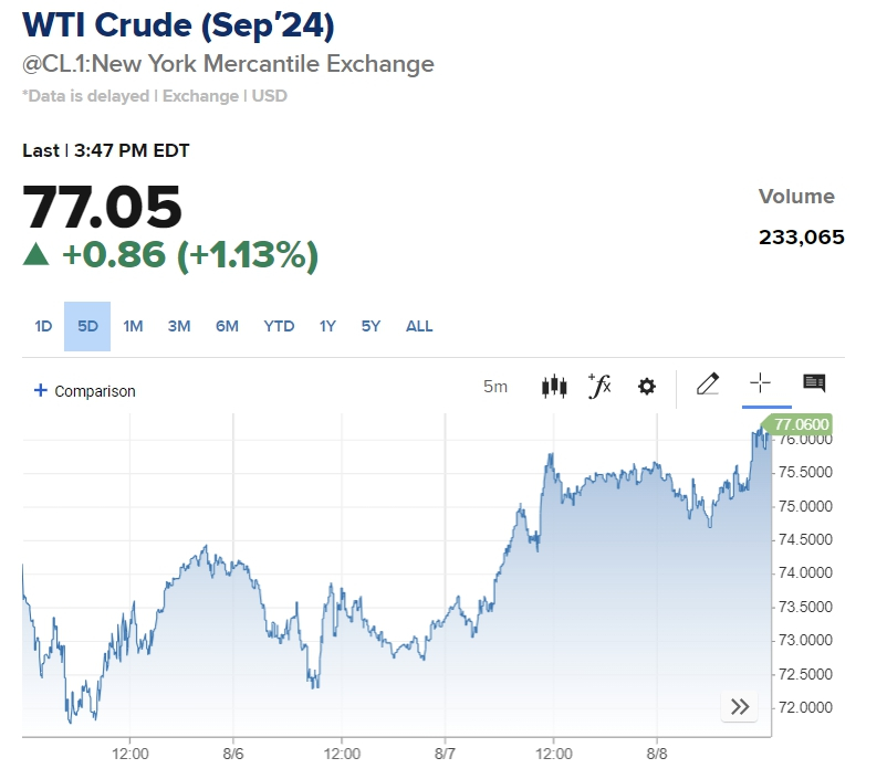 WTI는 이번 주초에 경기침체 우려로 배럴당 71달러 후반대까지 떨어졌다. 그러나 침체 우려에 과장된 해석이 끼어있다는 지적이 나타나고, 그 사이 중동에서 이란과의 확전 가능성이 대두되자 WTI 가격은 오름세를 지속해 77달러까지 상승했다.