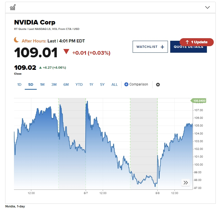 최근 주당 100달러대 이하로 떨어졌던 엔비디아는 이날 4.06%나 상승해 109달러를 기록했다. 그라소 글로벌 CEO(최고경영자)인 스티브 그라쏘는 "엔비디아 주가는 단기적으로 120달러로 돌아갈 수 있다"며 "확실한 모멘텀 주식이기 때문에 생각보다 빨리 120달러대 주가를 보게 될 것"이라고 말했다.