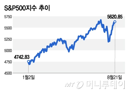 S&P500지수는 21일(현지시간) 전일 대비 0.4% 오른 5620.85로 마감했다. 이는 지난 8월5일에 기록한 전 저점 5186.33에 비해 8.4% 반등한 것이다. 지난 7월16일에 기록한 사상최고치 5667.20에 비해서는 불과 0.8% 낮은 수준이다.
