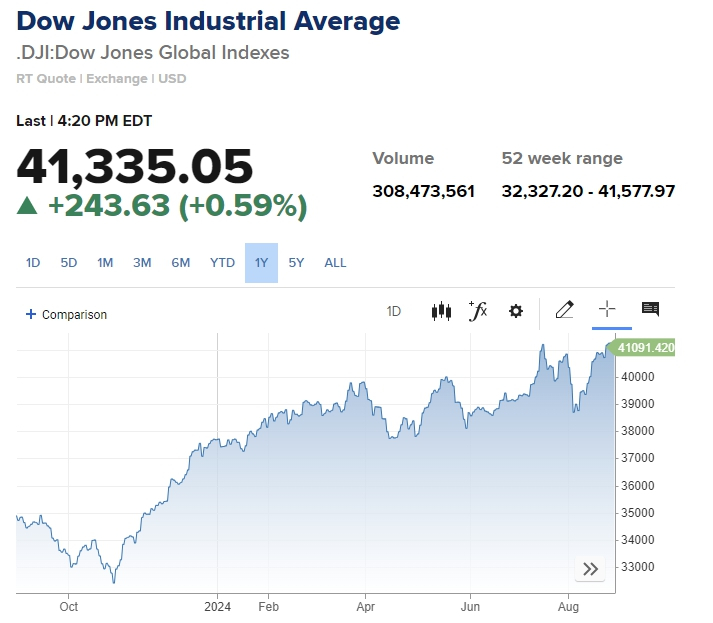 29일(현지시간) 뉴욕증시에서 다우존스 지수는 전거래일보다 243.63포인트(0.59%) 상승한 41,335.05를 기록했다. 그러나 S&P 500 지수는 0.22포인트 내려 전 거래일과 비슷한 5591.96을 나타냈다. 나스닥도 39.6포인트(0.23%) 떨어져 지수는 17,516.43에 마감했다.