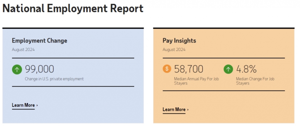 8월에 일자리가 늘어난 영역은 교육 및 건강 서비스(2만 9000개), 건설(2만 7000개), 기타 서비스(2만개), 금융(1만 8000개), 무역 운송 및 유틸리티(1만 4000개) 등이었다. 규모별로는 50명 미만 고용사가 9000명 감소한 반면 50~499명 미만 고용사는 6만 8000명 증가했다. ADP에 따르면 직장을 옮기지 않은 이들의 연간급여는 7월과 거의 같은 수준인 4.8% 증가하는데 그쳤다.