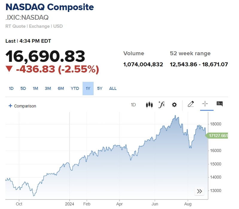 6일(현지시간) 뉴욕증시에서 다우존스 지수는 전거래일보다 410.34포인트(1.01%) 하락한 40,345.41을 기록했다. S&P 500 지수도 94.99포인트(1.73%) 내린 5408.42를 나타냈다. 나스닥은 436.83포인트(2.55%) 하락해 지수는 16,690.83에 마감했다.