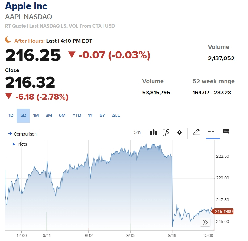 빅테크 가운데선 애플 주가가 2.73% 떨어지면서 최대 낙폭을 기록했다. 뱅크오브아메리카(BOA)와 JP모건 등 투자은행들이 신제품 아이폰 16을 내놓은 애플에 대한 고객 수요가 지난해보다 감소할 수 있다고 지적한 영향이 컸다. 엔비디아가 1.95%, 테슬라가 1.54% 하락했다. 마이크로소프트(MS)와 알파벳 등은 강보합세를 나타냈고, 아마존은 0.86% 떨어졌다.