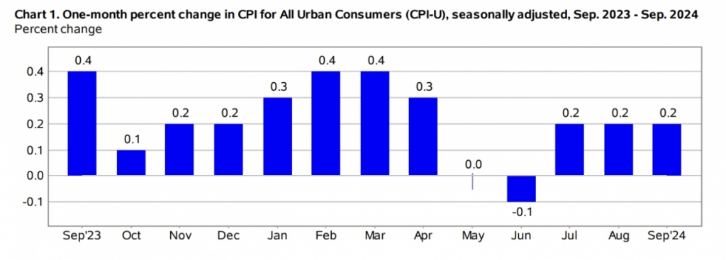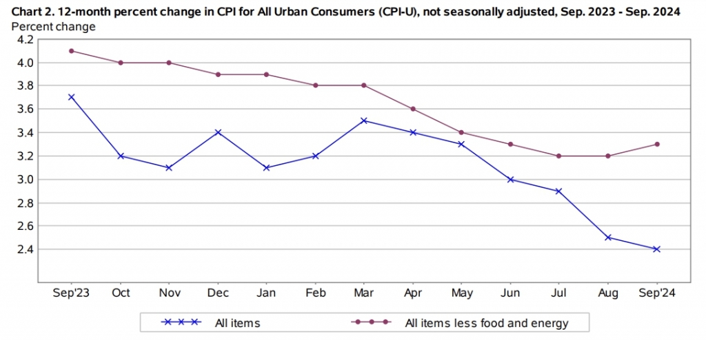 미국의 지난 9월 CPI가 전문가 예상치보다 높은 것으로 나타났다. CPI는 주요 인플레이션 지표 중 하나로, 미국 기준금리 향방을 예측할 가늠자 역할을 한다. 이날 블룸버그 등에 따르면 미 노동부 고용통계국이 집계한 지난달 CPI는 1년 전보다 2.4%, 1달 전보다 0.2% 상승한 것으로 집계됐다. 전문가들은 전년비 2.3%, 전월비 0.1% 상승을 예측했다.