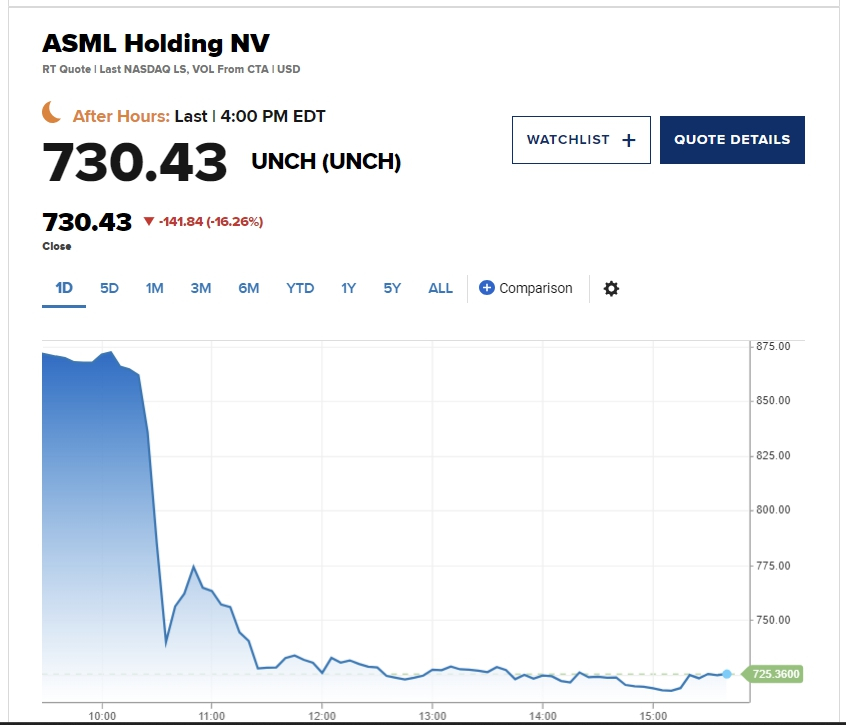 이날 반도체 제조사들의 상위 노광장비 기업 네덜란드 ASML이 16% 이상 급락하면서 장 분위기를 좋지 않게 만들었다. 이 회사 CEO(최고경영자)는 기업 고객들이 신중한 구매에 나서고 있다고 말했고 업황의 회복은 기대했던 것보다는 느리다고 지적했다. 엔비디아는 주당 140달러대를 앞두고 5% 가까이 고꾸라졌다. AMD 역시 5% 이상 급락하면서 드러나지 않은 수요 부진을 의심받았다. 실적을 발표한 기업 가운데 뱅크오브아메리카는 예상보다 나은 결과를 보고하면서 장중 2%대 상승하다가 막판에 강보합세로 거래를 마무리했다. 유나이티드헬스케어는 연간 매출전망을 낮추면서 7% 이상 급락했다.