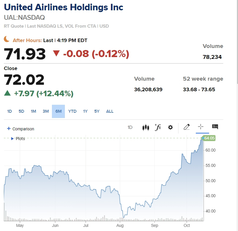 유나이티드항공은 12.36%나 급등했다. 3분기 매출과 이익을 모두 전문가 예상을 뛰어넘었고 4분기 실적도 강세를 보일 것으로 예상한 덕을 봤다. 이들은 코로나19 팬데믹 이전 이후로 처음으로 15억 달러 규모의 자사주 매입을 시작한다고 밝혔다.