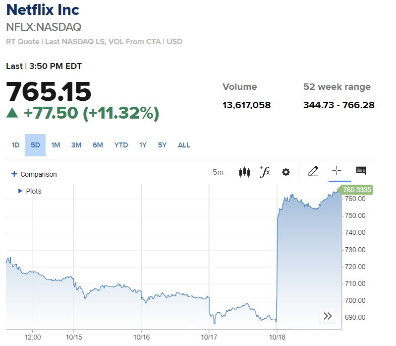 넷플릭스는 전일 장 마감 후 실적발표에서 3분기에만 멤버십이 35%나 증가했다고 밝히면서 이날 주가가 11% 이상 급등했다. S&P 500 기업 가운데 70개 이상이 3분기 실적을 발표했는데 그중 75%가 월가의 기대치를 뛰어넘는 호실적을 나타냈다.