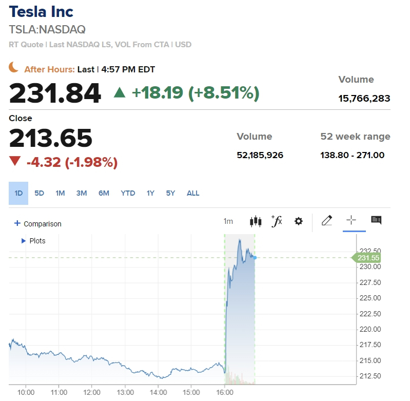 테슬라는 이날 장 마감 후 3분기 이익이 예상치를 웃도는 실적을 내놓았다. 이 기간 대출은 251억 8200만 달러를 기록해 LSEG가 집계한 월가의 예상치 253억 7000만 달러에 다소 미치지 못했다. 그러나 주당이익(EPS)은 72센트로 나타나 예상치 58센트를 크게 상회했다.