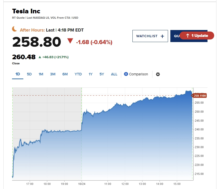 테슬라 주가가 전일 발표된 3분기 실적과 창업주 일론 머스크의 장밋빛 전망에 힘 입어 하루새 20% 이상 급등했다. 이날 테슬라 주가는 전 거래일 대비 21.92% 점프한 주당 260.48달러를 기록했다. 회사는 전일 장 마감 후 예상치 보다 다소 낮은 3분기 매출을 보고했다. 분석가들의 기대는 253억 7000만 달러였지만 실제 결과는 251만 8000만 달러 수준이었다.