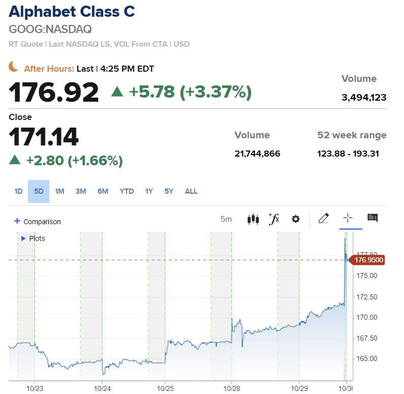 이날 알파벳은 3분기 매출이 882억 7000만 달러를 기록해 LSEG 예상치인 863억 달러를 상회했다고 밝혔다. 주당 순이익도 2.12달러로 예상치 1.85달러를 훨씬 넘어섰다. 이날 정규장에서 1.66% 상승한 알파벳은 시간외 거래에서도 3.3% 이상 오르고 있다.