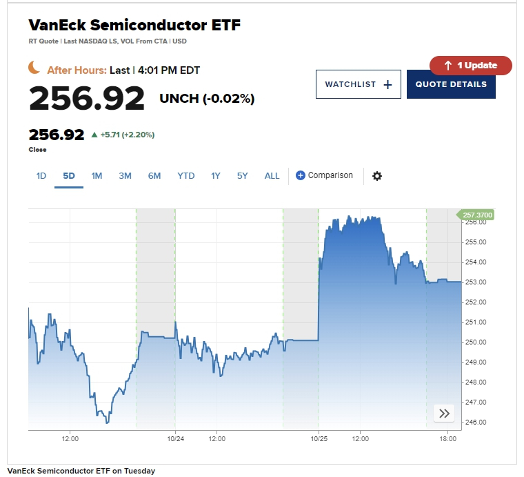 나스닥의 거듭된 사상최고치 행진은 반도체주 상승에 힘 입은 것이다. 이날 관련 상장주가지수 펀드인 VanEck Semiconductor ETF는 2.27% 상승하면서 7월 최고치에 다시 도전하는 모습을 보였다. AI 대장주인 엔비디아는 0.52% 상승해 주당 141.25달러를 기록했고, 슈퍼마이크로컴퓨터도 3.98%나 올랐다. TSMC는 2.01% 상승했다.
