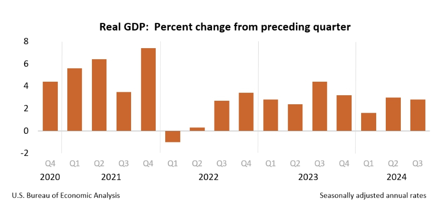 미국 경제가 3분기 GDP(국내총생산) 성장률이 예상보다 낮은 2.8% 성장에 그쳤다. 미국과 같은 대국이 2.8% 성장한 것이 절대적인 의미에서 낮은 것이라고 평가할 수는 없지만 예상치보다는 약간 저조한 수준이다. 다만 우려했던 수준의 경착륙 징후가 보이지 않고 있다는 분석에 따라 경제에 커다란 심리적 충격은 없을 거란 지적이다.