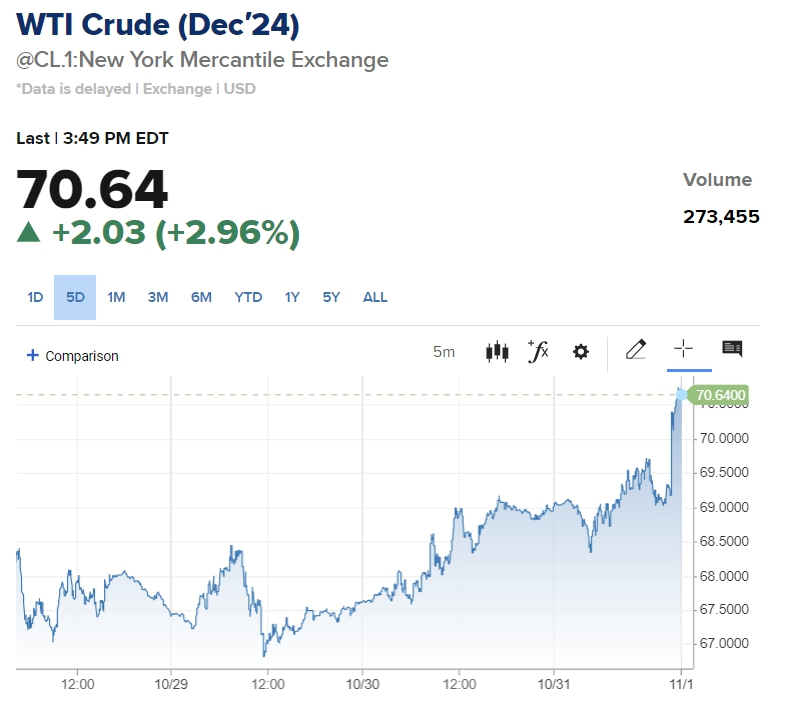 산유국 기구인 오펙(OPEC) 플러스가 생산량 증가를 지연시킬 수 있다는 가능성이 제기되면서 이날 미국산 원유가격은 3% 가까이 올랐다. 이날 서부텍사스산중질유(WTI) 12월물 선물 가격은 전 거래일 대비 2.9% 상승하면서 배럴당 70달러를 돌파했다. 브렌트유 가격도 0.8% 이상 상승해 배럴당 73달러대에 들어섰다. 로이터는 이날 오펙플러스가 12월에 계획된 생산량 증가를 한 달 이상 연기할 수 있다고 전했다.