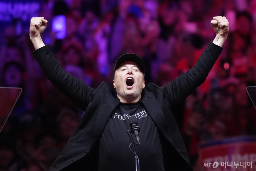 ![[뉴욕=AP/뉴시스] 일론 머스크 테슬라 최고경영자(CEO)가 27일(현지시각) 미국 뉴욕의 매디슨 스퀘어 가든에서 열린 공화당 대선 후보 도널드 트럼프 전 대통령의 유세에 참석해 트럼프 지지를 호소하고 있다. 2024.10.28. /사진=민경찬](https://thumb.mt.co.kr/cdn-cgi/image/f=avif/21/2024/11/2024110906171565247_1.jpg)