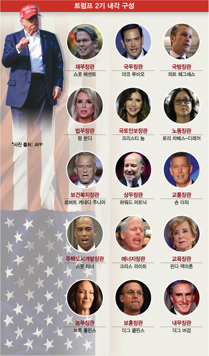 도널드 트럼프 2기 행정부 인사 키워드는 '충성심'과 '미국 우선주의'로 요약된다. 트럼프 당선인은 자신의 의제에 반대하지 않을 충성파 인사들로 2기 내각을 완성했다. 외교·안보 라인엔 대중 강경파를, 경제 라인은 관세 옹호론자를 중용했다. 40대와 TV 진행자 출신들도 눈에 띈다. 미국우선주의를 내세워 효율과 혁신 중심으로 자신의 의제를 속도감 있게 밀어붙이겠단 의지를 드러낸 것으로 평가된다.