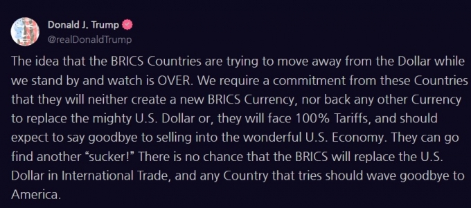 그는 이날 트루스소셜에 "브릭스 국가들이 새로운 브릭스 통화를 만들거나, 달러를 대체할 다른 통화를 지원하지 않겠다는 약속이 필요하다"면서 "그렇지 않으면 이들은 100% 관세를 맞게 되고, 멋진 미국 경제에 물건을 파는 것과의 작별을 생각해야 한다"고 위협했다. 관세 수위는 캐나다 등에 대한 것보다 훨씬 높다.