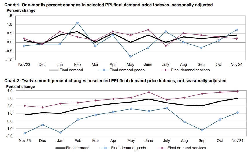 이날 미국 노동부 통계국에 따르면 11월 생산자 물가지수(PPI)는 전월비 0.4%, 전년비 3% 상승한 것으로 나타났다. 다우존스 합의 추정치가 전월비 0.2%였던 것을 감안하면 기대보다 높은 상승으로 지난해 2월 이후 가장 큰 폭의 오차로 분석된다.
