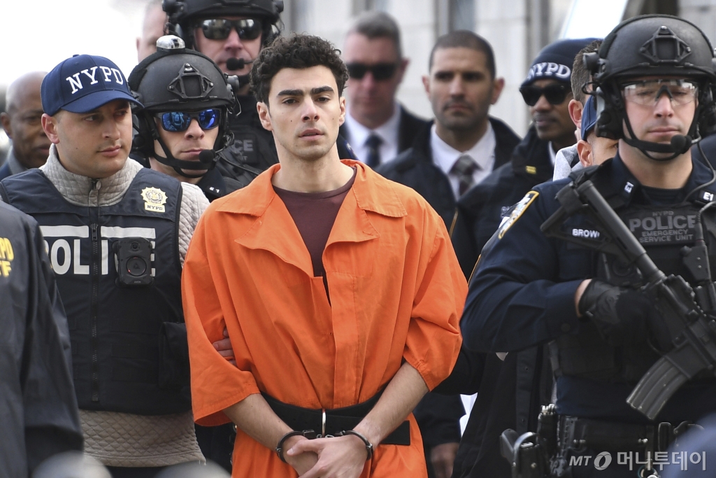 ![[뉴욕=AP/뉴시스] 유나이티드헬스케어 브라이언 톰슨 CEO의 살해 용의자 루이기 맨지오니가 19일(현지시각) 미국 뉴욕에서 경찰에 의해 호송되고 있다. 2024.12.20. /사진=민경찬](https://thumb.mt.co.kr/cdn-cgi/image/f=avif/21/2024/12/2024122409535469248_1.jpg)