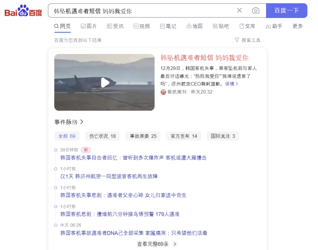 애도와 관심은 중국 거의 전 영역에 걸쳐 확산하고 있다. 중국 최대 포털사이트 바이두엔 사고 이틀째인 30일 오전까지 검색순위 1위를 포함해 한국 사고 관련 소식이 상위 15위건 내 여러 건을 점유하고 있다. 중국 네티즌들은 해당 콘텐츠에 "눈물이 날 것 같다", "새해가 시작되겠지만 한국인들의 마음은 2024년에 멈춘 듯하다"는 애도의 뜻을 밝혀 많은 동의를 얻었다.