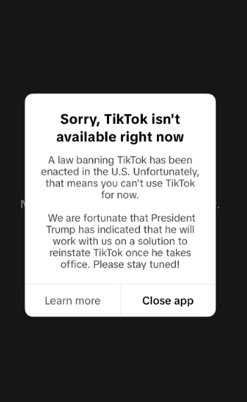 팝업으로 이어진 알림창은 "안타깝게도 틱톡 서비스를 금지하는 법이 19일부터 발효된다. 이에 따라 일시적으로 틱톡 서비스를 제공할 수 없게 됐다"는 문구와 함께 "가능한 한 빨리 미국 내 서비스를 복구하기 위해 노력하고 있다. 관심에 감사드리며 계속 지켜봐달라"고 안내했다. 또 "트럼프 대통령이 취임 후 우리와 함께 틱톡을 복원하기 위한 해결책 마련에 협력하겠다고 밝힌 점은 매우 다행스럽다"는 내용도 담았다.