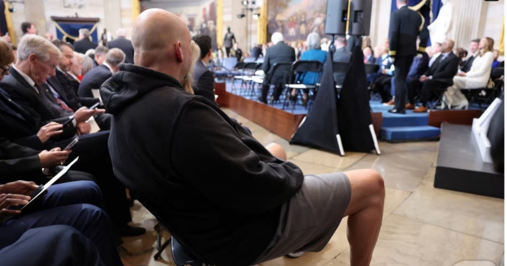 평소 캐주얼 복장을 즐겨 입는 민주당 소속 존 페터먼 미국 상원의원(펜실베이니아)이 후드티에 반바지를 입고 도널드 트럼프 미국 대통령 당선인의 취임식에 참석해 눈길을 끌었다.
