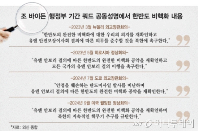 쿼드는 미국·일본·호주·인도 간 안보협의체로 대중국 견제를 위해 미국 주도로 2007년 출범해 바이든 행정부 임기 동안 2023년 3월 뉴델리 외교장관회의, 그해 5월 히로시마 정상회의, 지난해 7월 도쿄 외교장관회의, 같은 해 9월 미국 윌밍턴 정상회의 등에서 나온 공동성명 또는 정상선언에 '한반도 비핵화'를 포함한 북한 관련 언급이 단골 표현으로 들어가면서 국내외에서 관심을 받았다.