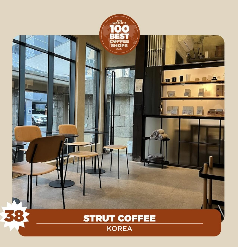 부산에 위치한 '스트럿커피'가 세계 최고의 카페 100곳 중 38위를 차지했다. 한국에 있는 카페 중 유일하다.