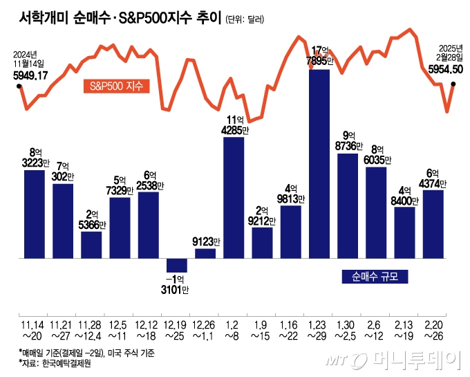 한국예탁결제원에 따르면 서학개미들은 지난 2월20일~26일(결제일 기준 지난 24~28일) 사이에 미국 증시에서 6억4374만달러를 순매수하며 9주째 매수 우위를 이어갔다.
