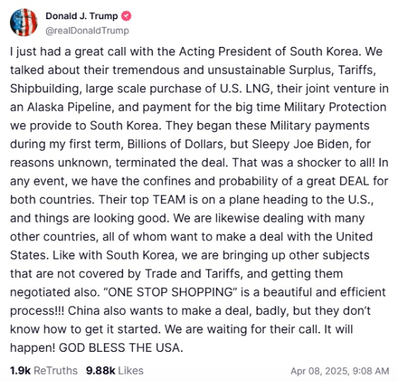 트럼프 대통령은 한 권한대행과 통화를 마친 직후 소셜미디어(SNS) 트루스소셜에 올린 글을 통해 "한국의 대통령 권한대행과 방금 훌륭한 통화를 했다"며 "대규모 (한국의 대미) 흑자와 관세, 조선, 미국산 액화천연가스(LNG) 대량 구매, 알래스카주 파이프라인 합작 투자, (미국이) 한국에 제공하는 대규모 군사보호에 대한 비용 지불에 대해 이야기했다"고 밝혔다.