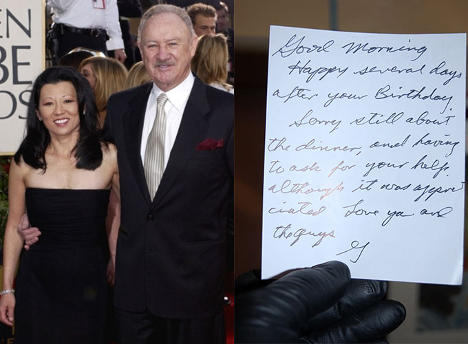 16일(현지시간) 미국 연예매체 '페이지식스'에 따르면 이날 미국 뉴멕시코주 산타페 카운티 보안관 사무소는 고인이 된 해크먼과 아라카와가 살던 저택 곳곳에서 발견된 손 편지를 공개했다.