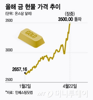 달러 리스크를 피해 새로운 안전자산으로 이동하는 자금이 몰리면서 금값은 연일 사상 최고가를 경신 중이다. 이날 금 현물 가격은 미국 동부시간 기준 장중 온스당 3500.1달러로 최고치 기록을 다시 썼다. 미국 경제매체 포브스의 스티브 포브스 회장은 "금값 상승은 달러가 약세로 갈 것이라는 확실한 신호"라고 말했다. 골드만삭스는 내년 중반 금값이 온스당 4000달러를 찍을 가능성이 있다고 전망했다.