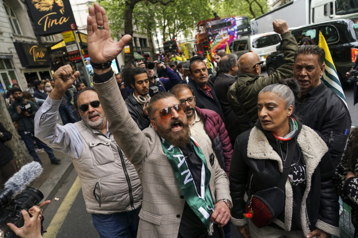 ![[런던=AP/뉴시스] 7일(현지 시간) 영국 런던에 있는 인도 고등판무관 건물 앞에서 파키스탄 국적으로 보이는 시위대가 인도의 미사일 공격에 항의하고 있다. 2025.05.08.](https://thumb.mt.co.kr/cdn-cgi/image/f=avif/21/2025/05/2025050810183723415_1.jpg)