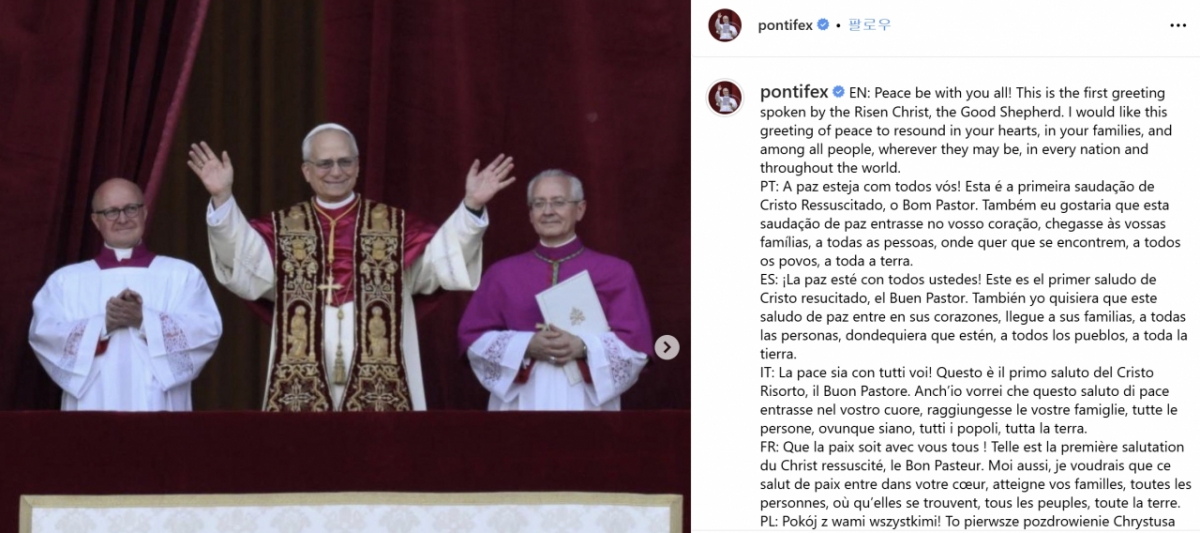 교황은 X와 인스타그램 첫 게시물을 통해 동일한 메시지를 전했다. 그는 "여러분 모두에게 평화가 함께하길 바란다"며 "이는 선한 목자이자 부활한 그리스도가 한 첫 인사"라고 했다.