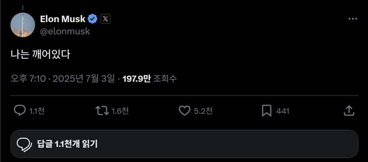X에서 테슬라조아(TeslaZoa)라는 이름의 이용자는 머스크가 올린 인공지능(AI) 경쟁 구도를 풍자한 밈(온라인 유행 콘텐츠) 사진 한 장을 인용해 "일론, 일어남"이라는 게시글을 올렸다. 이에 머스크는 "나는 깨어있다"라는 답글을 달았다.