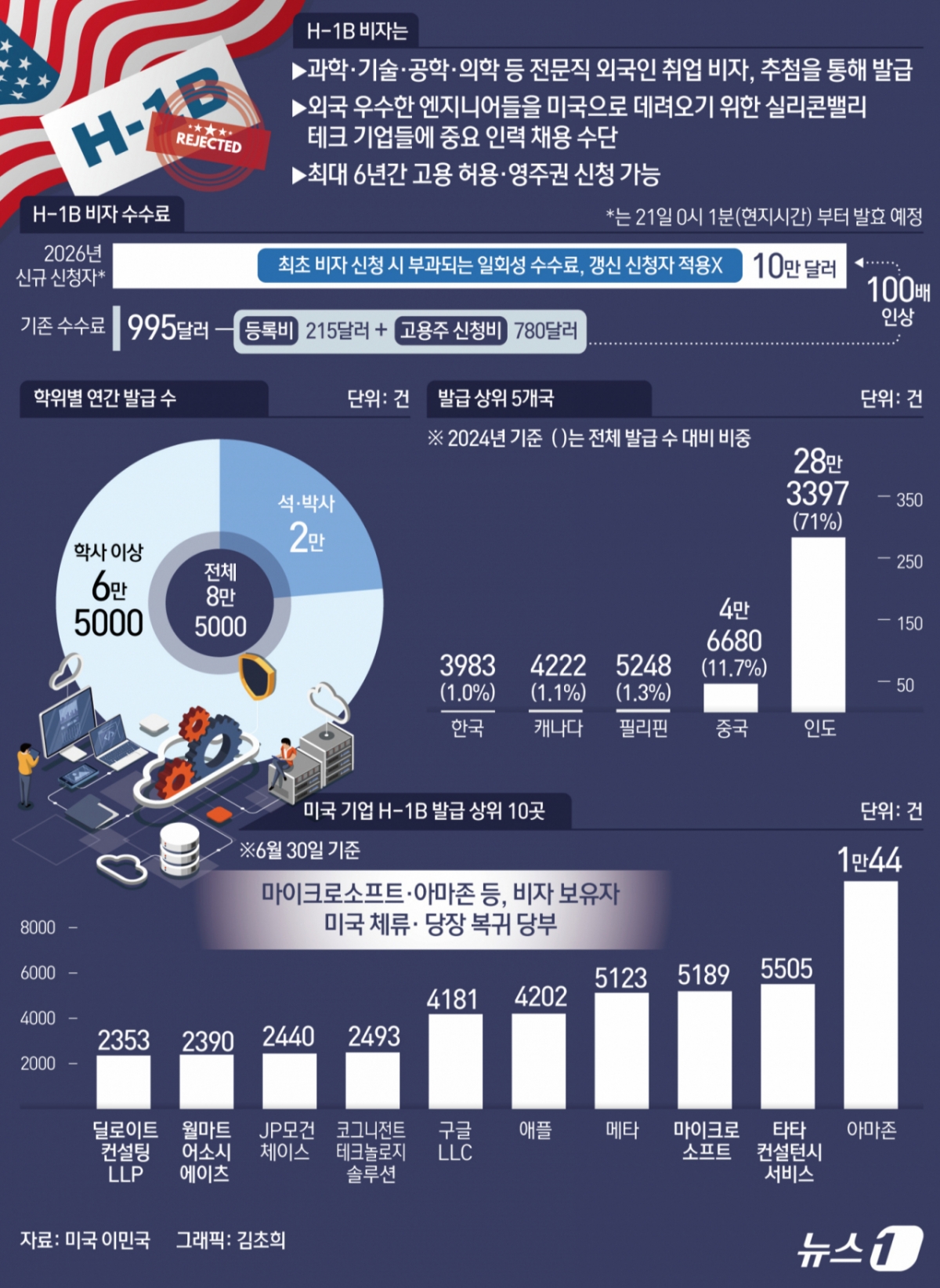 '아메리칸 드림'의 상징으로 통하는 전문직 취업비자(H-1B) 수수료가 21일(현지시간·한국시간 21일 오후 1시1분)부터 1인당 10만달러(약 1억4000만원)로 100배 인상됐다. 미국 도널드 트럼프 행정부가 당초 매년 내야 하는 수수료라고 밝혔다가 신규 비자를 신청할 때만 내는 일회성 수수료라고 한발 물러섰지만 앞으로 전문직 비자를 통한 미국 테크기업의 인재 수급이 차질을 빚을 수 있다는 지적이 나온다. 한국인 근로자 300여명이 체포·구금됐다가 풀려난 '조지아 사태'와 함께 트럼프 행정부 이민정책의 중대 변환점이 될 수 있다는 분석이다.