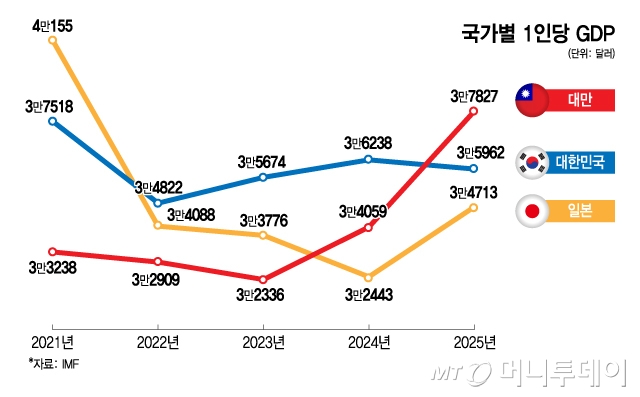 TSMC 주도의 반도체 산업으로 주목받는 대만의 사정은 다르다. IMF는 대만의 1인당 GDP가 작년 3만4060달러에서 올해 3만7827달러로 11.1% 증가해 세계 순위도 38위에서 35위로 뛸 것으로 봤다. 이대로면 한국을 제치게 된다. 또 내년에는 4만1586달러로 한국보다 2년 앞서 4만달러 선을 돌파하고, 세계 순위가 31위까지 치솟을 것으로 전망했다. IMF는 대만이 이례적인 고속 성장세를 유지해 5년 뒤인 2030년 1인당 GDP가 5만252달러로, 5만달러 선까지 넘어설 것이라고 분석했다.