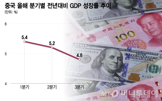 중국 국가통계국은 20일 3분기 GDP 성장률이 전년 동기 대비 4.8%를 기록했다고 밝혔다. 로이터통신 등 시장 예상치에 부합한 결과다. 하지만 분기 기준 올해 처음으로 5%에 미치지 못했다. 중국 정부가 설정한 올해 성장률 목표치는 '5% 안팎'이다.