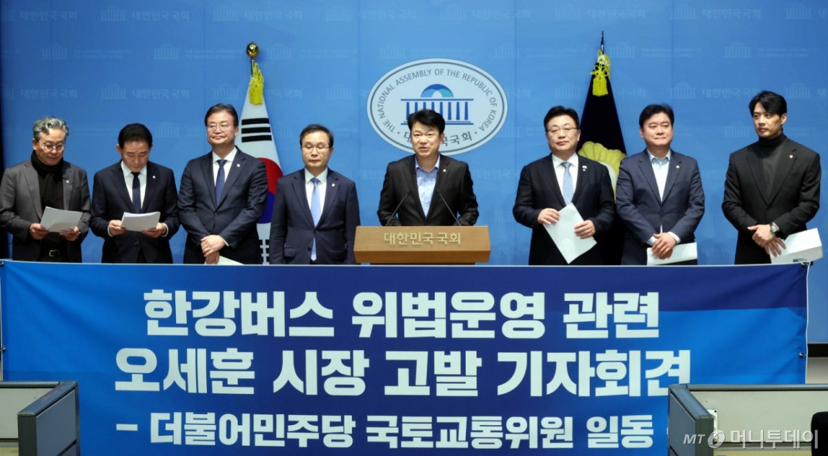 ![[서울=뉴시스] 조성봉 기자 = 복기왕 국회 국토교통위원회 더불어민주당 간사와 위원들이 26일 오후 서울 여의도 국회 소통관에서 '한강버스 위법운영' 관련 오세훈 서울시장 고발 기자회견을 하고 있다. 2025.10.26. suncho21@newsis.com /사진=조성봉](https://thumb.mt.co.kr/cdn-cgi/image/f=avif/21/2025/10/2025102615051027358_1.jpg)