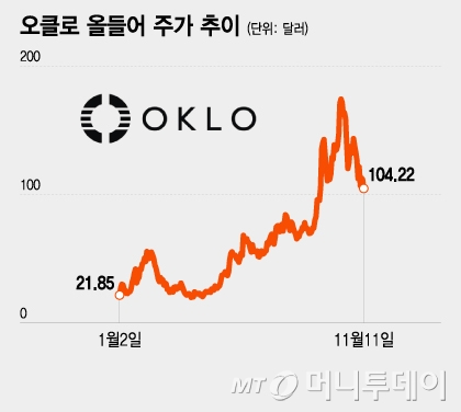 오클로 주가는 지난 10월14일 174.44달러로 종가 기준 사상최고가를 기록하고 다음날인 10월15일 장 중 한 때 193달러를 넘어섰다가 급락한 상태다.