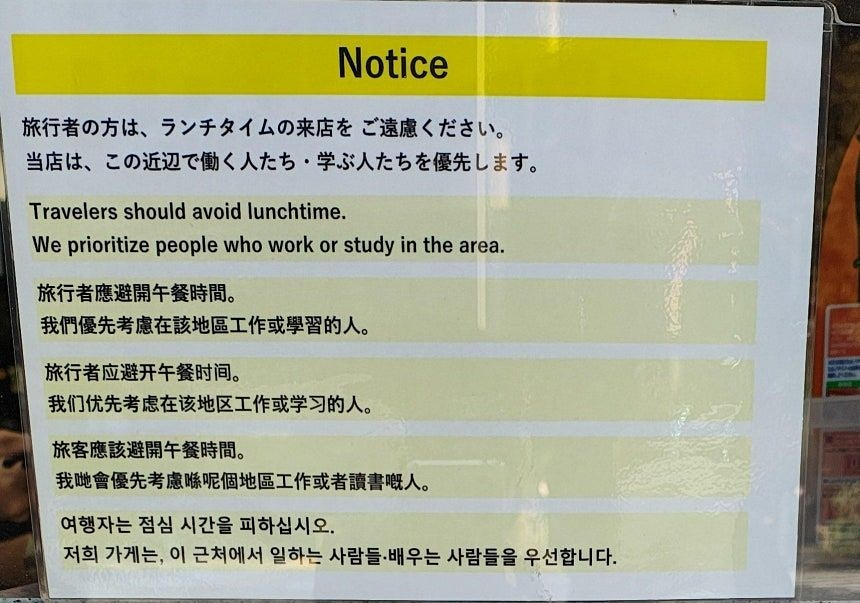 출입구에 붙은 안내문에는 '공지'라는 제목 아래 일본어로 "여행자는 점심시간을 피해달라. 저희 가게는 근처에서 일하는 사람들과 배우는 사람들을 우선한다"는 문구가 적혀 있었다.